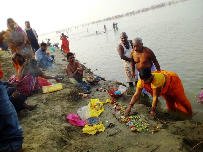 सिरहा। कात्तिक पूर्णिमामा कमला नदीको दृश्य रोमाञ्चक बनेको छ । पहेँलो धोती र सारीमा सजिएका नयाँ धामीझाँक्री हातमा बलेको आगोसहितको माटोको ढकना (भाडा) र बेतको लाठी घुमाउँदै कर्कश स्वरमा चिच्याउँदै यहाँ आउने गर्छन् ।