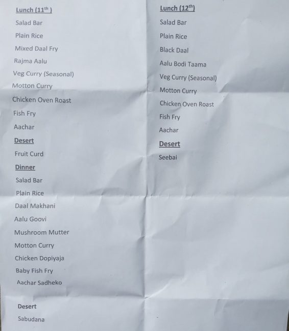दोस्रो छाकमा सलाद बार, सादा खाना, दाल मखनी, आलु गोभी, मसरुम मटर, मटन करी, चिकन डोपियाजा, माछा फ्राई, अचार साँदेको र सवुदाना हुने सञ्चालक दवाडीले जानकारी दिए ।