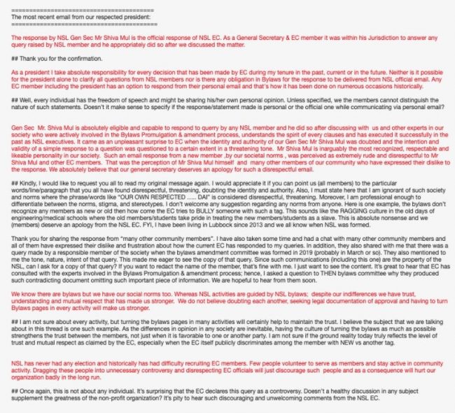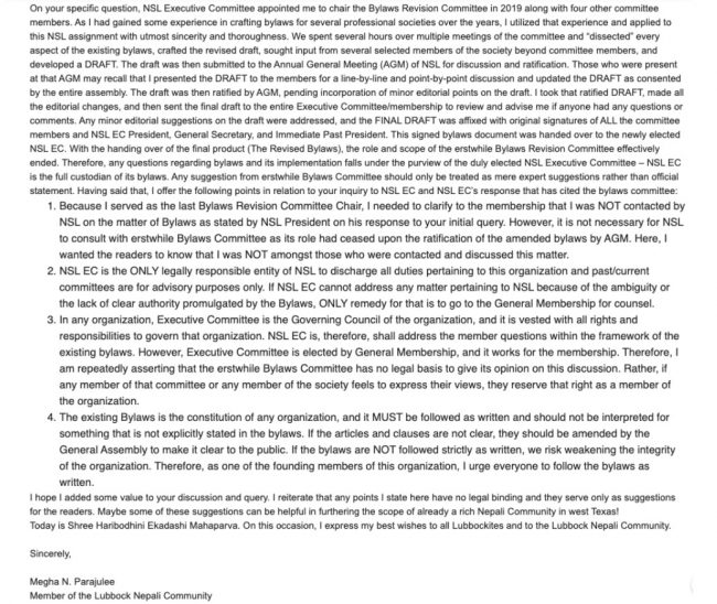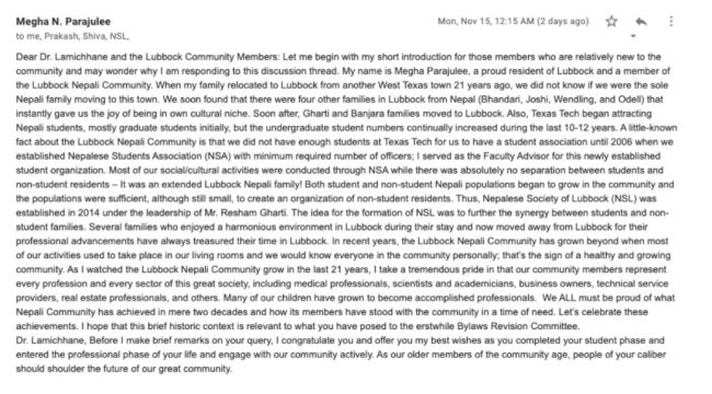 जिम्मेवार व्यक्ति समाजकाअध्यक्ष श्रेष्ठले आफ्नो मातहतको कार्यसमितिले गरेको निर्णयका विषयमा टसमस नभई उल्टै “लिगलभ्यान्यु” अर्थात् अदालत स्थानमै छलफल गर्न तयार रहेको जानकारी इमेलमार्फत दिएका छन् । उनको यो प्रतिक्रिया पछि यो विषयले समुदायलाई नै चुनौती दिएकोले टेक्सासको एटर्नी जनरलको कार्यालय या अदालतमा जाने भन्ने विषयमा परामर्श गरिरहेको जानकारी डा लामिछानेले डिसी नेपाललाई दिएका छन् ।