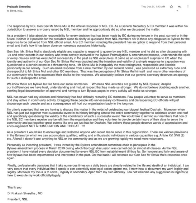 अन्तत समाजको एक सदस्यले संस्थाको विधानका विषयमा राखेको जिज्ञाशाबाट चर्केको विवादअसमझदारी र प्रर्याप्त छलफलको अभावमा अदालतको ढोकामै पुगेको छ । समाजभित्रको सो असमझदारीका विषयमा समाजका अध्यक्ष डा श्रेष्ठले प्रयाप्त छलफल नगरी संस्थाको विवादलाई अदालतमा लैजान प्रोत्साहित गरेका छन् । उनीद्वारा प्रेषित इमेलमा समस्याको समाधानभन्दा गैरजिम्मेजवार शैलीमा समाजको विवादअदालतको ढोकामापुर्याएको बुझ्न सकिन्छ । किनकि डा.श्रेष्ठले नै इमेलमाअदालत जाऊ भनेका  छन् ।