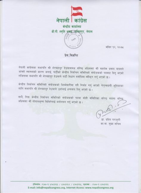 कांग्रेस केन्द्रीय निर्वाचन समिति संयोजक यादवको राजनीमा स्वीकृत, घिमिरे संयोजक तोकिए