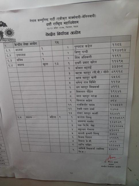 २५ सदस्यीय लेखा आयोगको अध्यक्षमा पुष्पराज कँडेल, उपाध्यक्षमा विष्णु पन्थी, सचिवमा शिव अधिकारीसहित १३ खुला सदस्य र नौ महिला सदस्य छन् । यस्तै, अनुसासन आयोगको अध्यक्षमा केशबप्रसाद बडाल, उपाध्यक्षमा नेत्रप्रसाद पन्थी, सचिवमा प्राडा भरतराज पहारीसहित खुला १३ र नौ महिला सदस्य निर्वाचित भएका छन् । एमालेको केन्द्रीय निर्वाचन आयोगको अध्यक्ष र पदाधिकारीको मनोनयन भने ललितपुरको गोदावरीमा सम्पन्न पहिलो विधान अधिवेशनले गरिसकेको छ । यो आयोगको अध्यक्षमा विजय सुब्बा छन् । उनी १०औँ राष्ट्रिय महाधिवेशनको केन्द्रीय निर्वाचन समितिको संयोजकसमेत हुन् ।