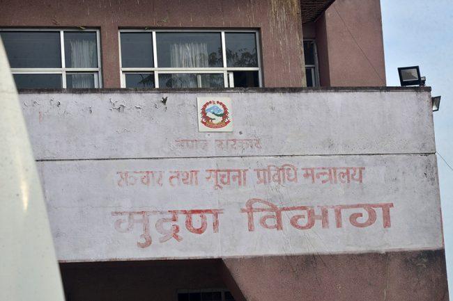 सिंहदरबरभित्र मुद्रण विभागको साइन बोर्ड खुइलिएको देखिन्छ । अन्य कतिपय मन्त्रालयका बोर्डमा पनि फोहोर जमेको अवस्थामा छन् ।
