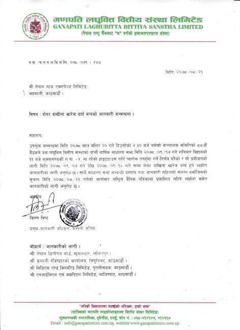 त्यसैगरी, संस्थाले साधारण सभा तथा लाभांश वितरण प्रयोजनको लागि पाैष ७ गतेदेखि पाैष १६ गतेसम्म बुकक्लोज गर्ने निर्णय गरेको छ । त्यसैले, पाैष ६ गतेसम्म कायम सेयरधनीले मात्र उक्त लाभांश प्राप्त गर्ने छन्  ।