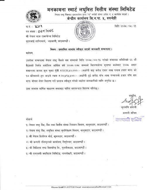 मनकामना स्मार्ट लघुवित्तद्वारा प्रस्तावित लाभांश राष्ट्र बैंकले गर्यो स्वीकृत