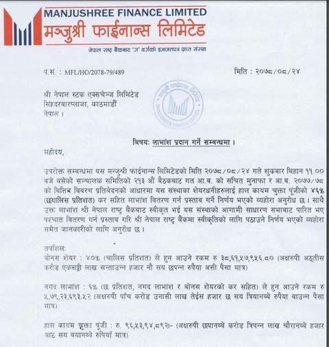 मञ्जुश्री फाइनान्सले गर्यो ४६ प्रतिशत लाभांश दिने घोषणा, बोनस र नगद कति ?