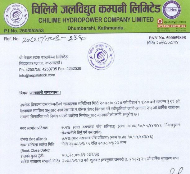 चिलिमे जलविद्युत कम्पनीले गर्यो १५ प्रतिशत लाभांश दिने घोषणा