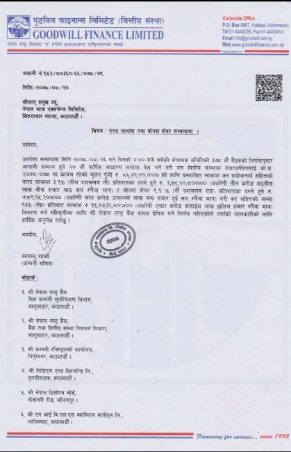 गुडविल फाइनान्सले १३ प्रतिशत लाभांश दिँदै, बोनस सेयर र नगद कति ?