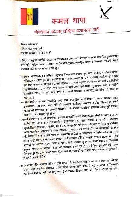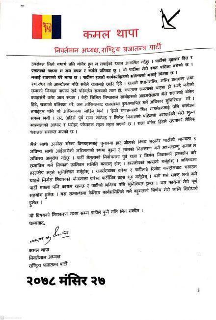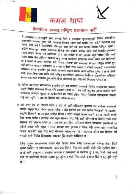‘पार्टी नेतृत्वको निर्वाचनमा पूर्वराजा र निर्मल निवासको हस्तक्षेपबारे छनाविन गर्न निष्पक्ष छानिवन समिति बनाउनुहोस् । हस्तक्षेपको भत्सर्ना गर्नुहोस् । भविष्यमा हस्तक्षेप नहुने सुनिश्चित गर्नुहोस् । राजसंस्थाकाबारेमा र पार्टीलाई रिमोट कन्ट्रोलबाट चलाउन चाहने निर्मल निवासको योजनाका वारेमा पार्टीभित्र बहस सुरू गर्नुहोस् । यसो गर्न सक्नु भयो भने पार्टी एकता पनि कायम रहन्छ र पार्टीको भविष्य पनि सुनिश्चित हुन्छ,’ थापाले जारी गरेको विज्ञप्तिमा उल्लेख छ ।