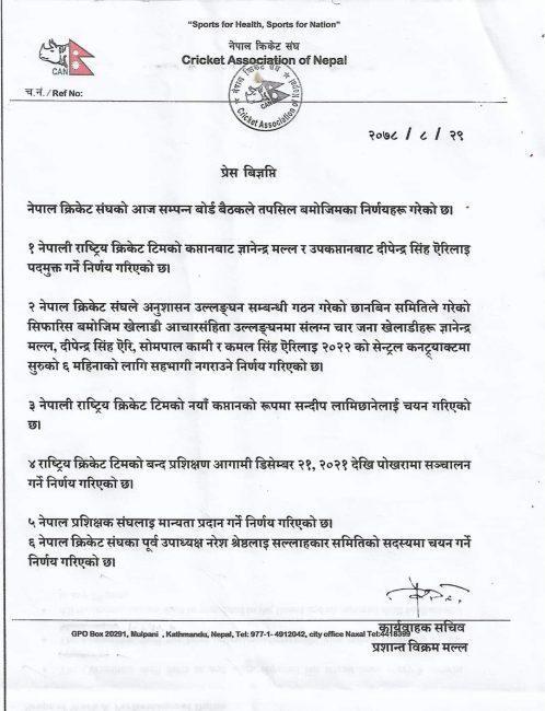 टोलीका नियमित कप्तान ज्ञानेन्द्र मल्ल र उपकप्तान दीपेन्द्र सिंह ऐरीलाई अनुशासन उल्लङ्घन गरेको भन्दै पदमुक्त सहित सेन्ट्रल कनट्याक्टमा सुरुको ६ महिना सहभागिता नगराउने क्यानको बुधबार बसेको बोर्ड बैठकले निर्णय गरेको हो ।