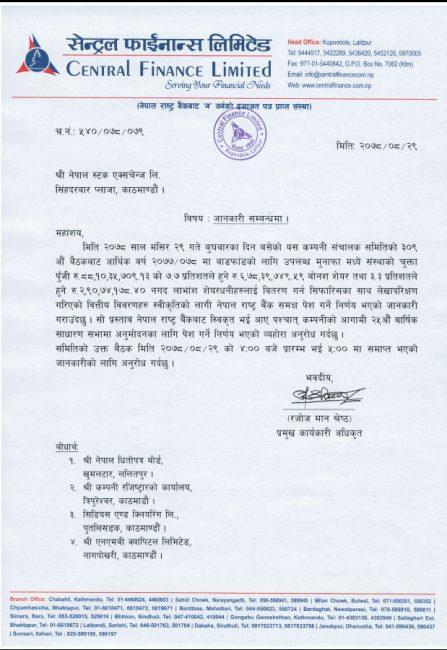 सेन्ट्रल फाइनान्सले ११ प्रतिशत लाभांश दिँदै