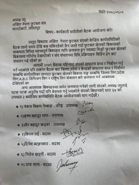 ‘संघको विधानको धारा ३७ को उपधारा २ बमोजिम कार्यसमिति बैठक आयोजनाको माग गर्दछौं,’ पत्रमा भनिएको छ ।