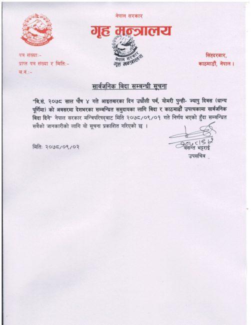 मन्त्रालयले उधाैली पर्व, याेमरी पुन्ही-ज्यापु दिवस (धान्य पूर्णिमा) काे अवसरमा देशभरका समुदायका लागि विदा र काठमाडाैं उपत्यकामा सार्वजनिक विदा निर्णय भएकाे जनाएकाे छ।