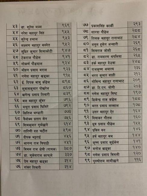 यस्तै रमेश लेखकले दुई हजार १३१, ज्ञानेन्द्रबहादुर कार्कीले दुई हजार १२७, शङ्कर भण्डारीले दुई हजार ११२, जीपछिरिङ लामाले दुई हजार ३५, अर्जुननरसिंह केसी दुई हजार ३०, गोपालमान श्रेष्ठले एक हजार ९५२, जीतजङ्ग बस्नेतले एक हजार ९३९, नैनसिंह महर एक हजार ८८३, सुनिलबहादुर थापाले एक हजार ८८१ र डा रामशरण महतले एक हजार ८७५ मत प्राप्त गरेका छन् । उनीहरु क्रमशः छैटौँ, सातौँ, आठौँ, नवौँ, दशौँ, एघारौँ, बाह्रौँ, तेह्रौँ, चौथौँ र पन्ध्रौँ स्थानमा रहेका छन् ।