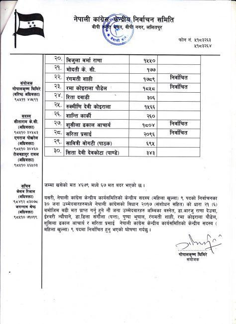 निर्वाचितमध्ये प्रसाईंबाहेक सबै शेरबहादुर देउवा प्यानलका हुन् । प्रसाई भने शेखर कोइराला प्यानलकी उम्मेदवार हुन् । ९ पदका लागि ३० जनाले उम्मेदवारी दिएका थिए ।