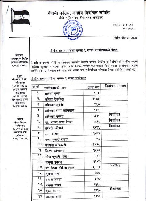 महिला खुला केन्द्रीय सदस्यमा एकजना बाहेक सबै देउवा प्यानलका विजयी