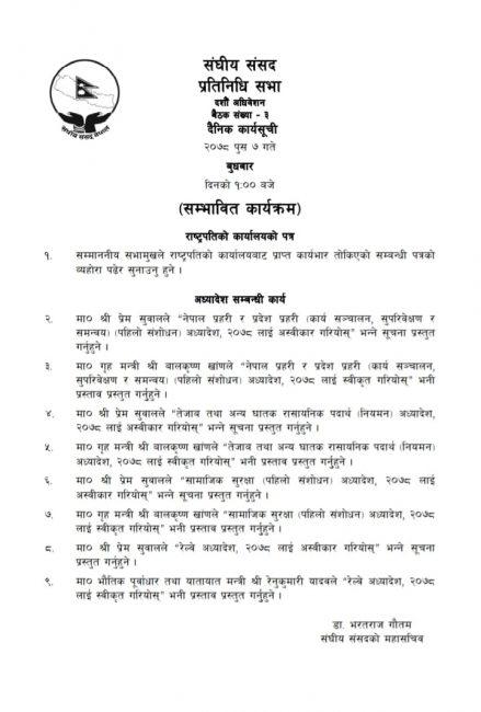 प्रतिनिधिसभाको बुधबार बैठक, चार अध्यादेश पेस गरिने सम्भावित कार्यसूची