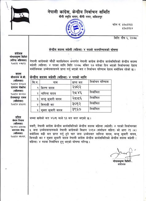 पूर्वराष्ट्रपति यादवका छोराले जित्दा उनकी भतिजी एवं वर्तमान राष्ट्रपति भण्डारीकी सम्धिनी किरण यादव पराजित भइन् । चार जना मधेशी महिला केन्द्रीय सदस्यमा २७२२ मत पाएर पाँचौं हुँदै किरण हारिन् । किरण यसअघि केन्द्रीय सदस्य थिइन् ।