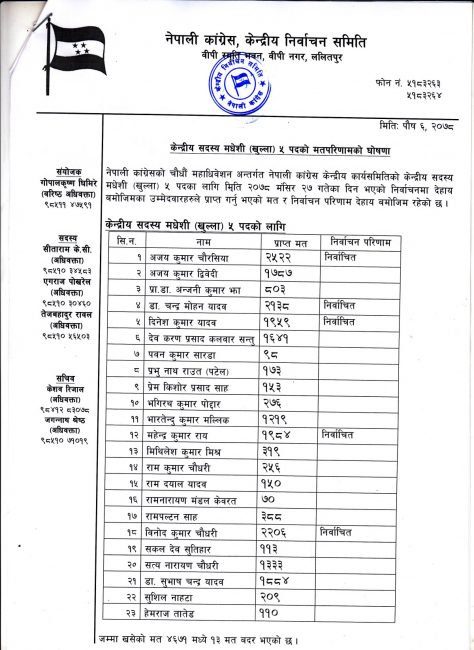 काठमाडौं । नेपाली कांग्रेसको १४औं महाधिवेशनअन्तर्गत भएको निर्वाचनको मतपरिणाम आउने क्रममा जारी छ । निर्वाचनमा पूर्वराष्ट्रपति डा. रामवरण यादवका छोरादेखि वर्तमान राष्ट्रपति विद्यादेवी भण्डारीका सम्धिनीसम्मले प्रतिस्पर्धा गरेका थिए ।