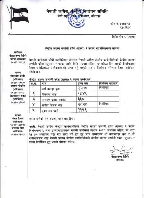 शाहले २८२० र बुढाले २२०० मत प्राप्त गरेका छन् । विजयी दुबै सभापति शेरबहादुर देउवा पक्षका हुन् । थानीले भने २१९९ मत पाए ।