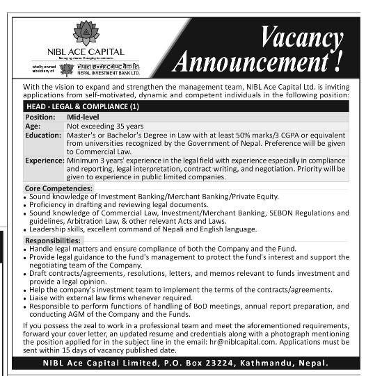 काठमाडौँ। एनआईबिएल एस क्यापिटलले कर्मचारी माग गरेको छ । क्यापिटलले बुधबार एक सूचना जारी गर्दै कर्मचारी माग गरेको हो। क्यापिटलले लिगल एण्ड कम्प्लेन पदका लागि एक जना कर्मचारी माग गरेको छ ।
