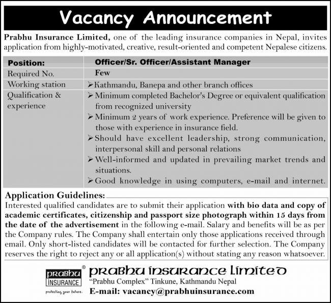 प्रभु इन्स्योरेन्सले माग्यो ३ पदका लागि कर्मचारी