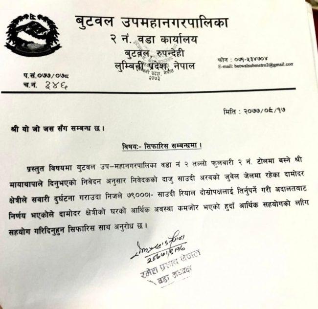 तर‚ गाडी दुर्घटना भएको कम्पनीले दामोदरलाई दुर्घटनामा बिग्रिएको गाडीको क्षतिपूर्ति रकम स्वरूप ७९ हजार साउदी रियाल अर्थात् करिब २५ लाख नेपाली रुपैयाँ माग गर्यो ।