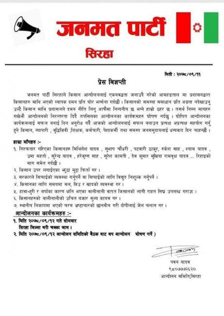 सिरहा। सिके राउत नेतृत्वको जनमत पार्टी सिरहाले किसानका सात बुँदे मागसहित आन्दोलनमा उत्रिएको छ।