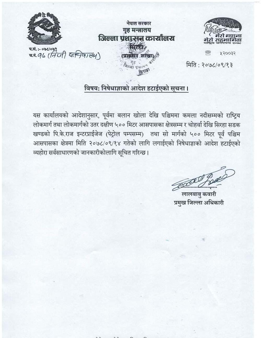 सिरहाका ६ राजनीतिक दलसहितको सर्वदलीय बैठकले पक्राउ परेकाहरुलाई रिहाइ र निषेधाज्ञा फिर्ता लिई शान्तिपूर्ण रुपमा निकास खोज्न आग्रह गरेपछि निषेधाज्ञा हटाइएको प्रमुख जिल्ला अधिकारी लालबाबु कवारीले जानकारी दिए ।