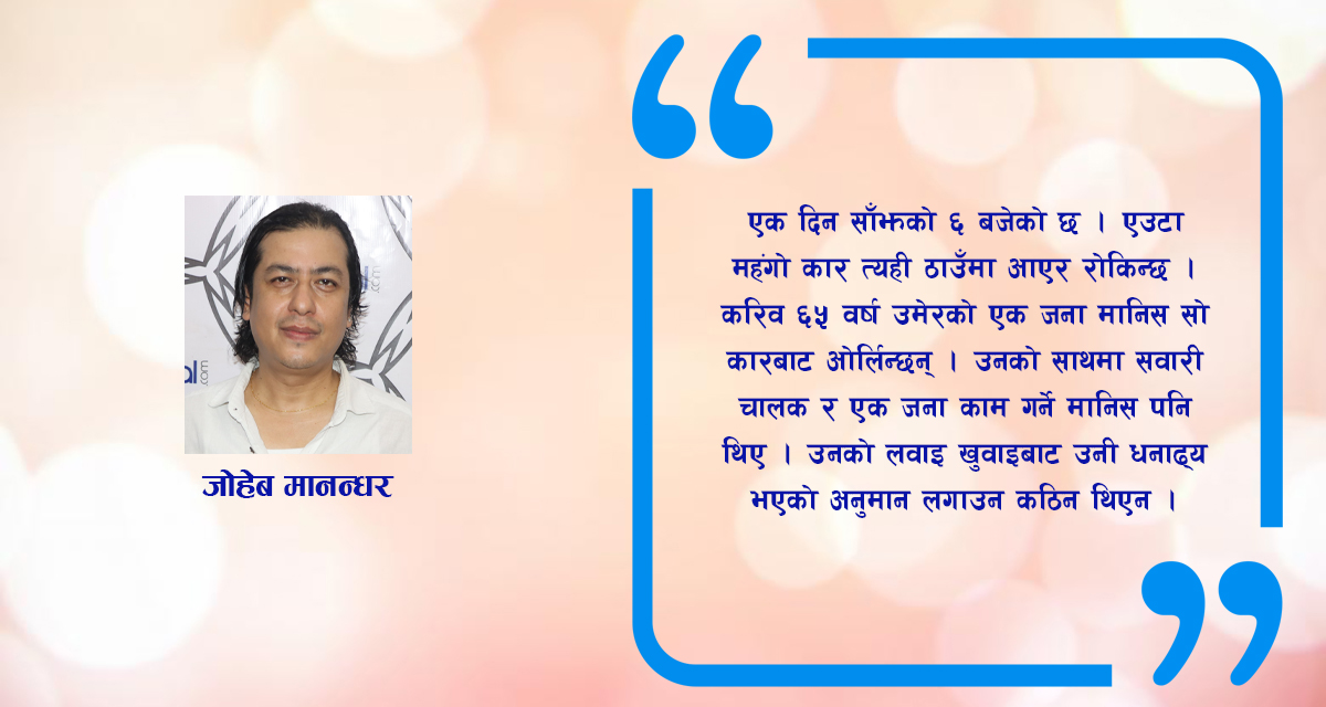 एक दिन साँझको ६ बजेको छ। एउटा महंगो कार त्यही ठाउँमा आएर रोकिन्छ। करिव ६५ वर्ष उमेरको एक जना मानिस सो कारबाट ओर्लिन्छन्। उनको साथमा सवारी चालक र एक जना काम गर्ने मानिस पनि थिए। उनको लवाइ खुवाइबाट उनी धनाढ्य भएको अनुमान लगाउन कठिन थिएन।