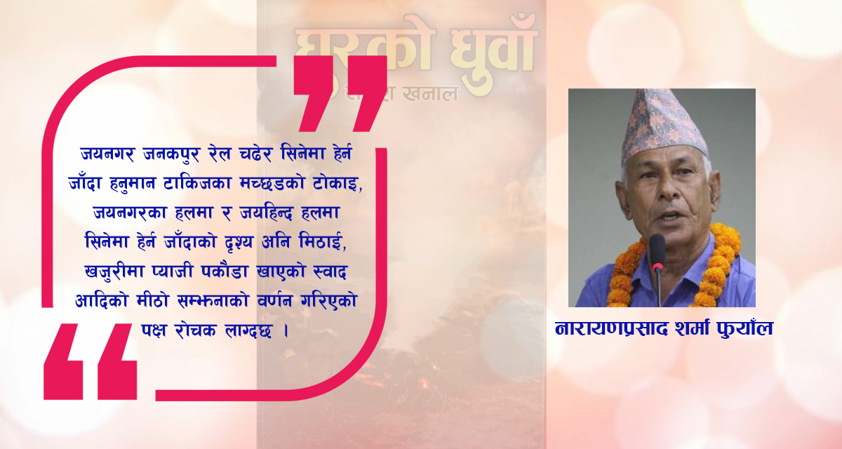 यही हो साथी आफ्नो जिन्दगी को कथा त, सानोसानो कुरामा खुशी खोज्छु। खुशी आफैं ठूलो बनी दिन्छ। दिन भरीको समय बिहान नातिलाई स्कुल पुराएदेखि सुरु हुन्छ। खाना खायो एकछिन घाममा बस्यो, किताब पढ्यो। यस्सो सुत्यो। फेरि नातिलाई स्कुलमा लिन गयो। यसरी नै ब्यस्त हुन्छु। बेलुका सबै परिवारसँगै बसेर हाँसी खुखी मिठो नमिठो जे छ खाँदै, नातिसँग खेल्दै, उसलाई कथा सुनाउँदै समय बित्छ। राति पनि हामीसँगै सुत्छ यो त। बाजेबज्यै भने पछि हुरुक्क हुन्छ।