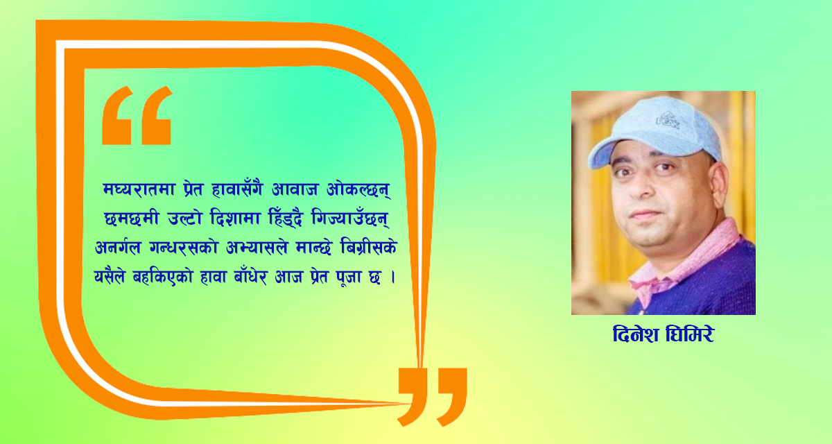 एकछिन अघिसम्म त्यो घमड मिश्रित अनुहारमा एकाएक उदाशी देखियो। हैन! भाउजु त बितिसक्यो। यहाँ म एक्लै छु। दुई जना काम गर्ने छन्, अनि ड्राइभर छ भनेर अनुहार मलिन बनायो। छोराहरुले उता नै जाउँ भन्छन्।तर मलाइ जान मन छैन। उनीहरु यता बस्न मान्दैनन्। कहिले म जान्छु एक दुई महिना बस्छु, कहिले उनीहरु यता आउन्छ्न ।ठिकै छ सन्तान को खुशी नै आफ्नै खुशी हो।प्रश्स्त सम्पती छोडिदिएको छु पछि को लागि भन्दै चिया को सुर्को लाउन्छ।