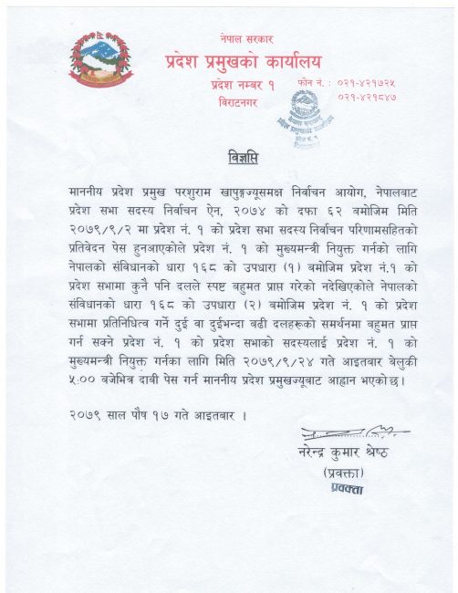प्रदेश १ : एक साताभित्र मुख्यमन्त्री पदमा दाबी पेस गर्न प्रदेश प्रमुखको आह्वान