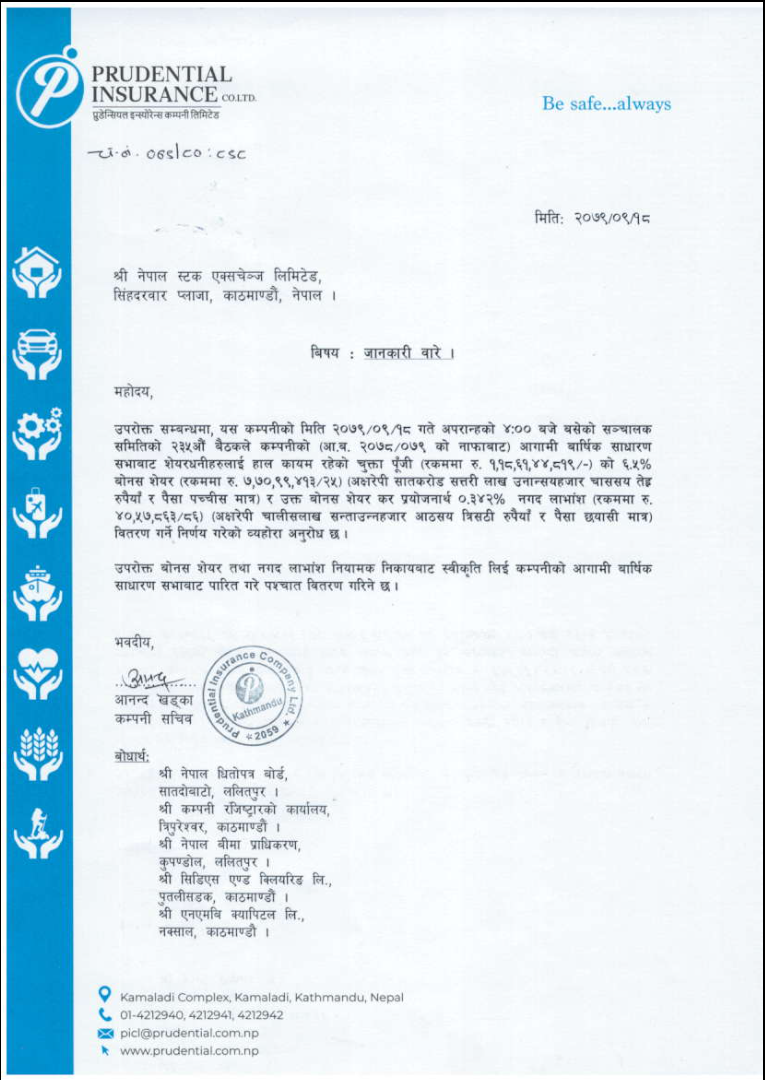 प्रुडेन्सियल इन्स्याेरेन्सले गर्यो लाभांश दिने घोषणा