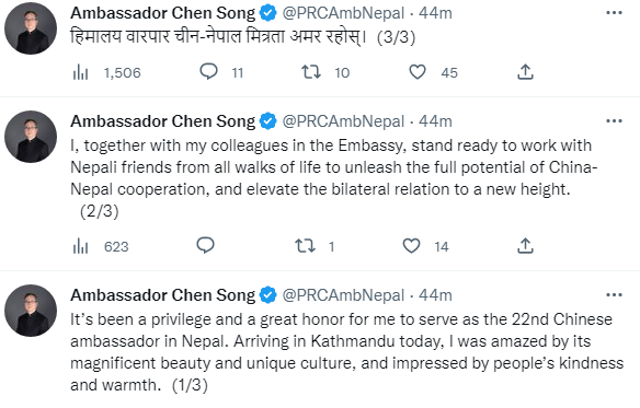 चिनियाँ राजदूत चेन सोङ्ग काठमाडौं आइपुगे