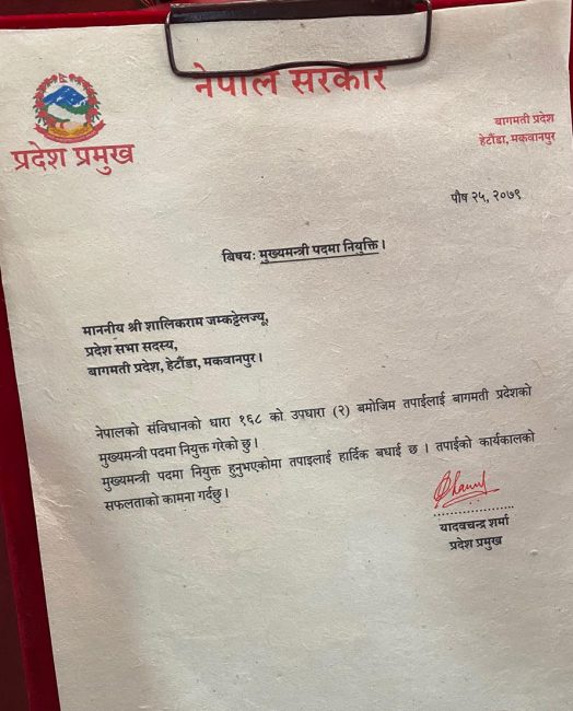 बागमती प्रदेशको मुख्यमन्त्रीमा शालिकराम जम्कट्टेल नियुक्त
