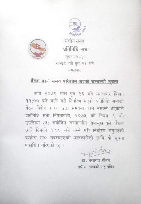 काठमाडौं। ११ बजे बस्ने तय भएको प्रतिनिधिसभा बैठक दुई घण्टा पछि सरेको छ। संसद सचिवलयका अनुसार संसद बैठक दिउँसो १ बजे बस्ने गरी सरेको हो।