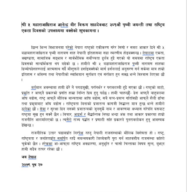 पृथ्वीजयन्तीको पूर्वसन्ध्यामा ज्ञानेन्द्रको सन्देश- राष्ट्रियताबिनाको प्रजातन्त्र कागजी सिद्धान्तमात्र हुन्छ