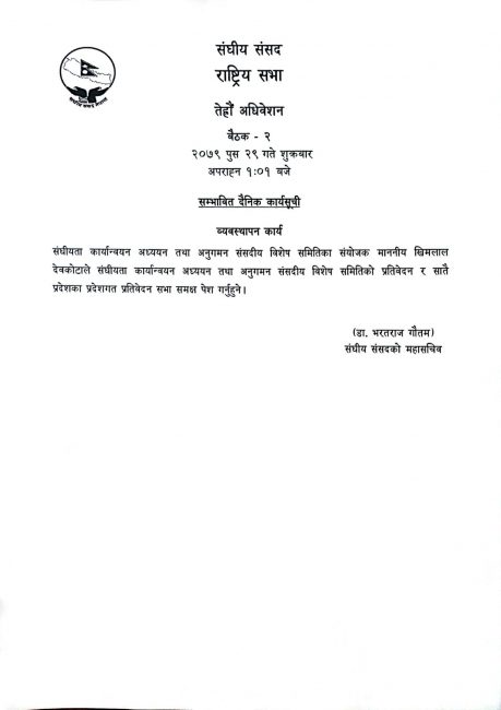 भोलि राष्ट्रिय सभा बैठक, एक बुँदे सम्भावित कार्यसूची सार्वजनिक