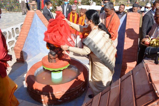 समाजले निर्माण गरेको दश अवतारसहितको ब्रम्हाको मूर्ति अनावरण गर्दै राष्ट्रपति भण्डारीले मूर्तिमा पञ्चामृत स्नानसमेत गरेकी थिइन्।