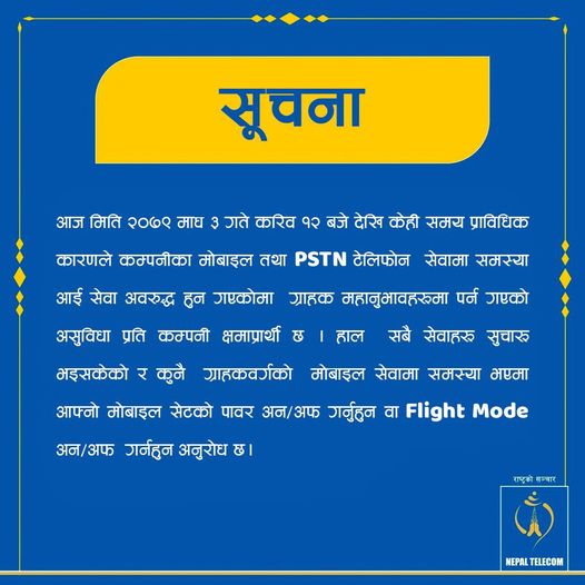 काठमाडौं । नेपाल टेलिकमको समस्या समाधान भएको छ । टेलिकमको नेटवर्कमा माघ ३ गते करिब १२ बजे देखी टेलिकमको नेटवर्कमा समस्या देखिएको थियो । नेपाल टेलिकले सुचना जारी गर्दै समाधान भएको बताएको छ।