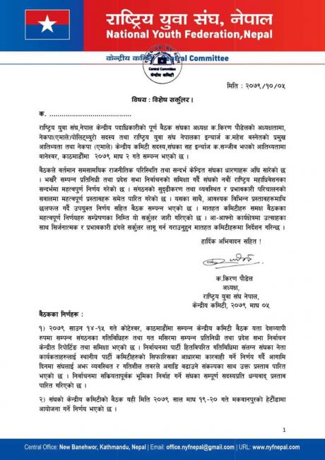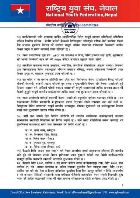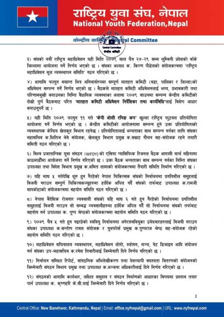 यस्तै, आगामी फागुनमसान्तभित्र अनिवार्य रुपमा सम्पूर्ण मातहत कमिटी (वडा, पालिका र जिल्लां) को अधिवेशन सम्पन्न गर्ने पनि भएको जनाइएको छ।