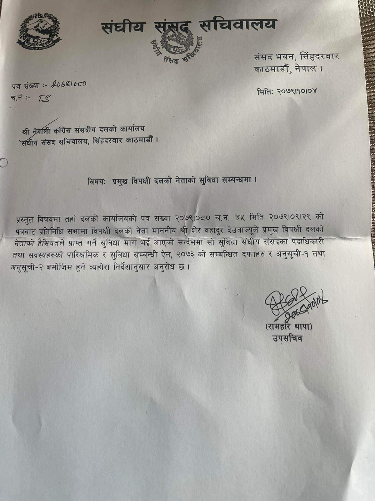 सचिवालयले कांग्रेस संसदीय दलका नेता शेरबहादुर देउवालाई प्रमुख विपक्षी दलको नेताको हैसियतले कानुनअनुसार सेवासुविधा प्राप्त हुने पत्रमार्फत जनाएको छ।