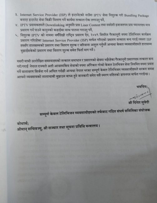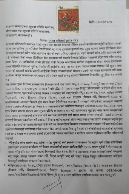 काठमाडौं। नेपाल केवल टेलिभिजन व्यवसायी महासंघले ऊर्जामन्त्री राजेन्द्र लिङ्देनलाई आफूहरुको माग सम्बोधन गरिदिन आग्रह गर्दै ज्ञापनपत्र बुझाएको छ।