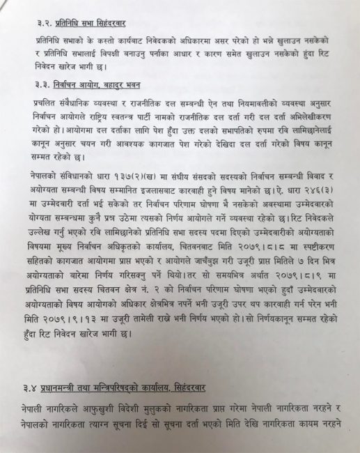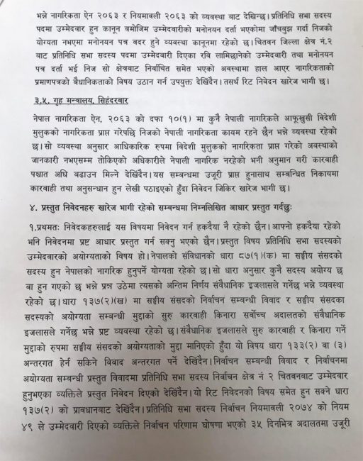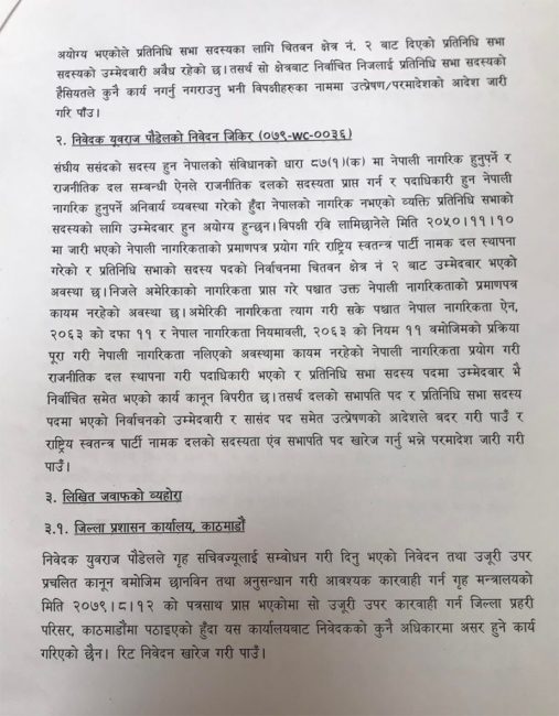 नागरिकताको वैधतमा प्रश्न उठाउँदै लामिछानेको प्रतिनिधिसभा सदस्य खारेजीको माग गर्दै अधिवक्ता रबिराज बसौला समेत र अधिवक्ता युवराज पौडेलसमेतले दायर गरेको दुईवटा छुट्टाछुट्टै रिटमाथि बुधबारदेखि संयुक्त रुपमा संवैधानिक इजलासमा सुनुवाइ भइरहेको हो ।