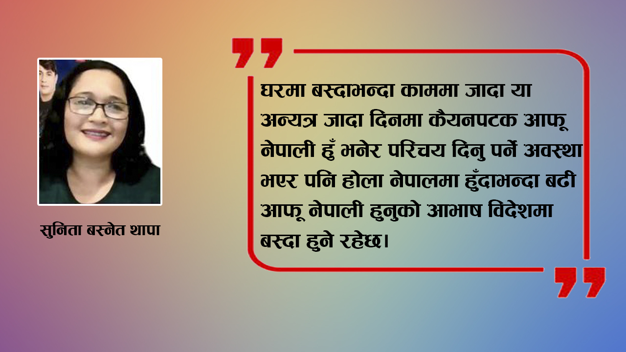 स्वभावैले कर्मठ र इमान्दार भनेर चिनिएका छौं हामी नेपाली। घरमा बस्दाभन्दा काममा जादा या अन्यत्र जादा दिनमा कैयनपटक आफू नेपाली हुँ भनेर परिचय दिनु पर्ने अवस्था भएर पनि होला नेपालमा हुँदाभन्दा बढी आफू नेपाली हुनुको आभाष विदेशमा बस्दा हुने रहेछ।