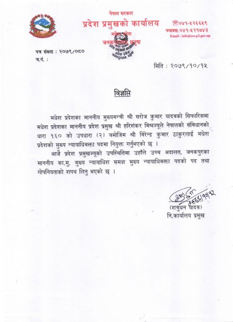 जनकपुरधाम । नवनियुक्त मधेश प्रदेशको मुख्य न्यायाधिवक्ता वीरेन्द्रकुमार ठाकुरले पद तथा गोपनीयताको शपथ लिएका छन् ।