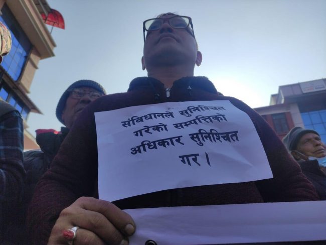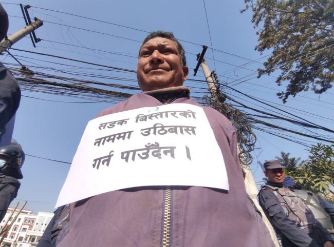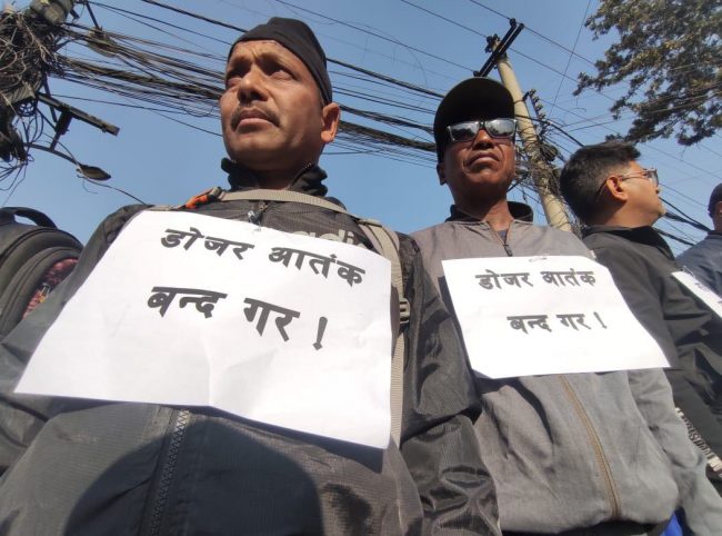 ‘डोजर आतंक बन्द गर, महानगरको ज्यादती बन्द गर, सडक विस्तारका नाममा उठिबास गर्न पाइँदैन, संविधानले सुनिश्चित गरेको सम्पत्तिको अधिकार सुनिश्चित गर,’ जस्ता नारा लेखेको प्लेकार्ड बोकेर काठमाडौंवासी प्रदर्शनमा उत्रिएका हुन् ।