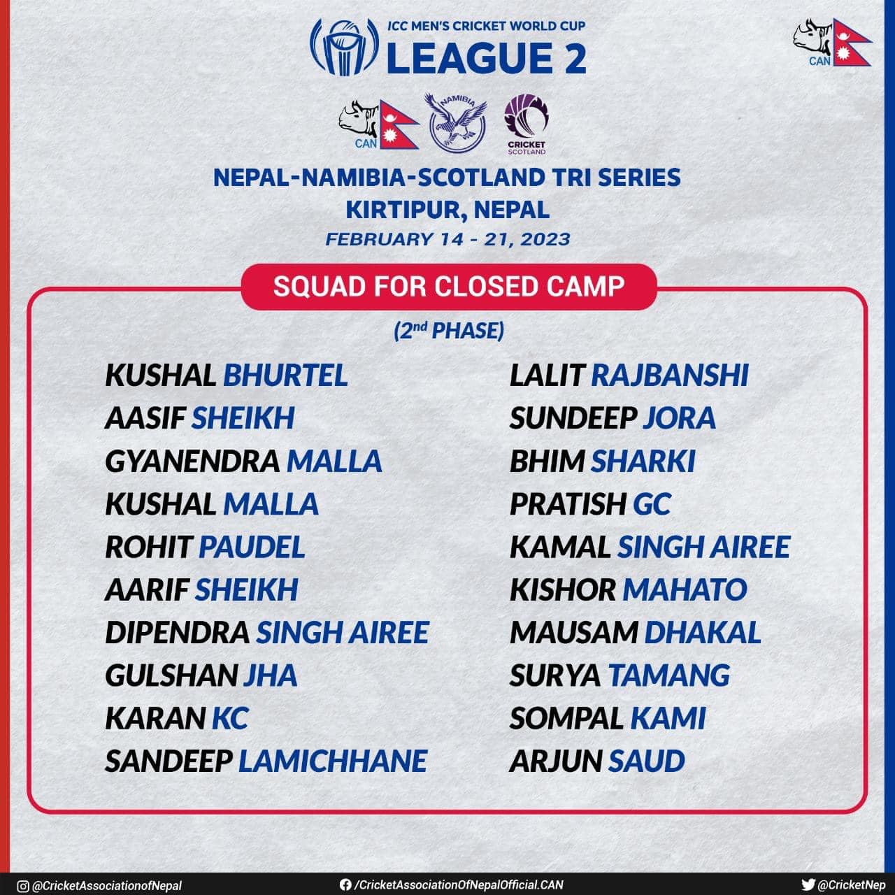 बिहिबार यसअघिको २८ जनाको प्रारम्भिक टोलीबाट १० जनालाई बाहिर राख्दै बन्द प्रशिक्षणको लागि २० सदस्यीय टिम घोषणा भएको छ । टिममा सन्दिप र प्रतिश जिसी समावेश भएका छन् ।