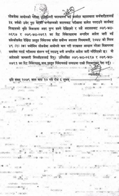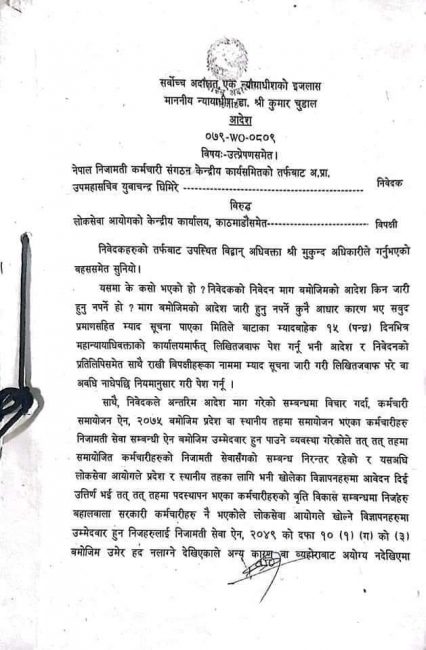 नेपाल निजामती कर्मचारी संगठनको तर्फबाट उपमहासचिव युवाचन्द्र घिमिरेले दायर गरेको रिटमाथि शुक्रबार सुनुवाइ गर्दै  सर्वोच्चका न्यायाधीश कुमार चुँडालको एकल इजलासले लोकसेवाले दरखास्त आह्वान गरेका विज्ञापनमा बहालवाला कर्मचारीलाई सहभागी गराउन अन्तरिम आदेश दिएको हो ।